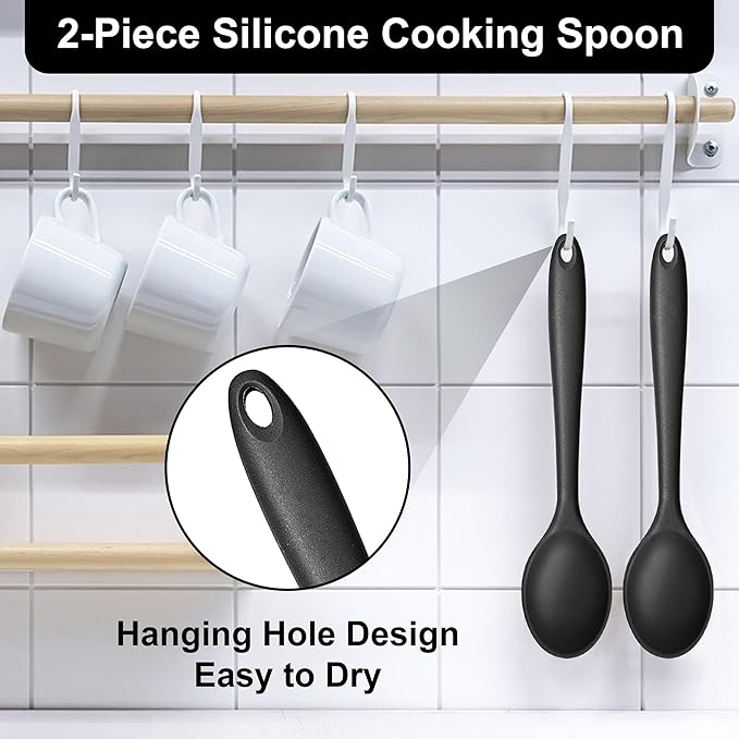E-far Silicone Cooking Spoon Set of 2, Heat Resistant Kitchen Spoons Utensils Nonstick Mixing Spoon for Baking Stirring Serving, Non-Toxic & Dishwasher Safe (Black)