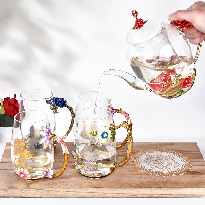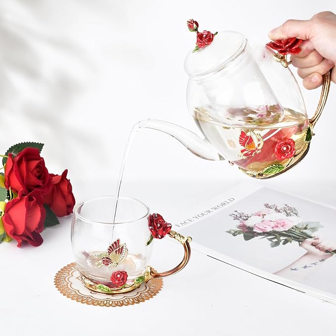 Enamel Glass Flower Tea Pot With Removable Loose Tea Leaf Infuser Tea Maker Teapot Set 30.4OZ Gifts for Women,Mom,Birthday
