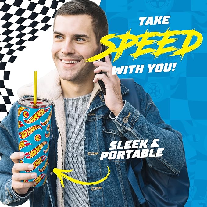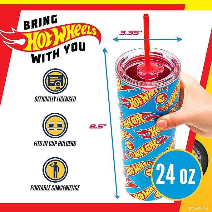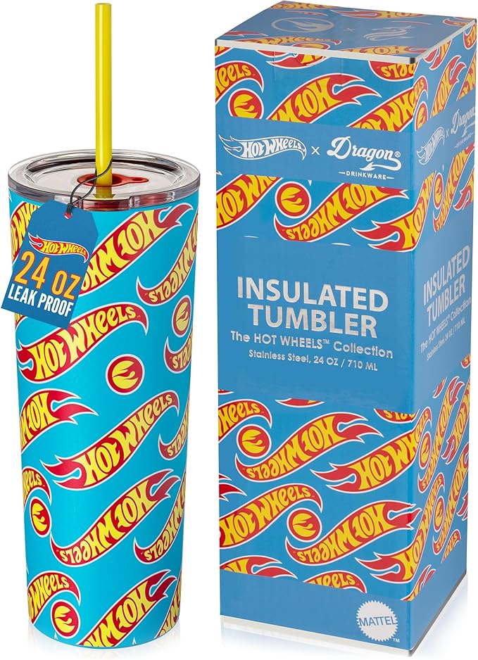 Dragon Glassware x Hot Wheels Insulated Tumbler with Lid and Straw - 24 oz Tumbler Cup with 2 Straws - Stainless Steel Tumbler with Straw for Water, Iced Tea - Travel Coffee Tumbler - Race Team