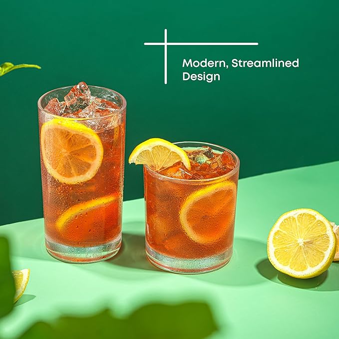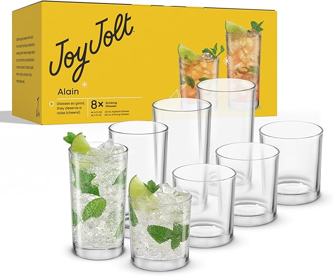 JoyJolt Alain Drinking Glasses Set of 8 Glass Tumblers. Highball 14oz Bar Glasses and Lowball 10oz Rocks Glasses Set. Cocktail, Juice, Whiskey Glasses or Water Glasses. Kitchen or Bar Glassware Set