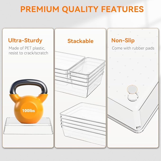 Criusia 12 Pack Large Clear Plastic Drawer Organizer Trays | MULTI-USE Acrylic Drawer Storage for Kitchen, Bathroom, Makeup, Office, School, Undies | College Dorm Room, Home Apartment Essentials
