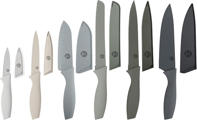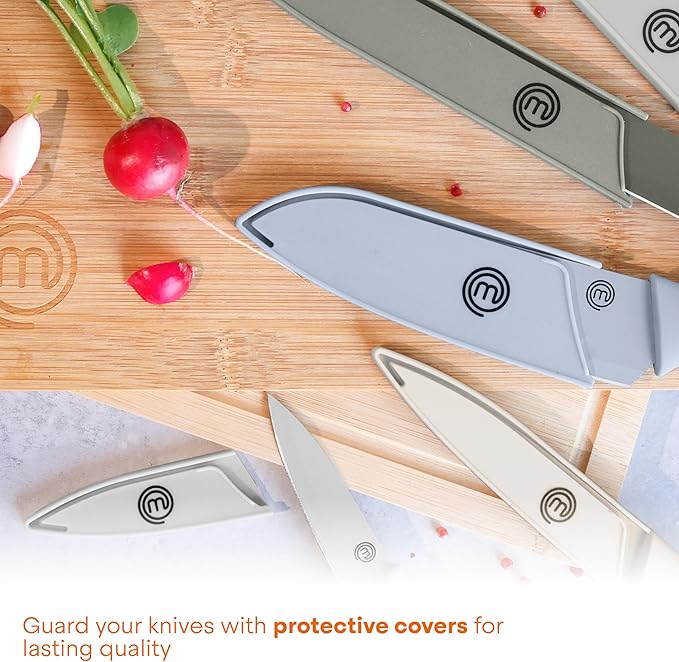 MasterChef Kitchen Knife Set with Covers, 6 Professional Chef Knives for Home Kitchens, Extra Sharp Cutting Stainless Steel Blades & Protective Sheaths, Soft-Touch Easy-Grip Handles, Earth Greys