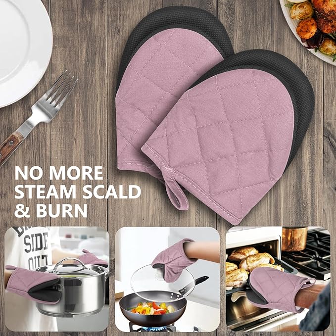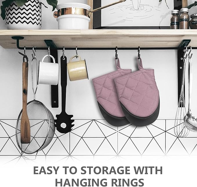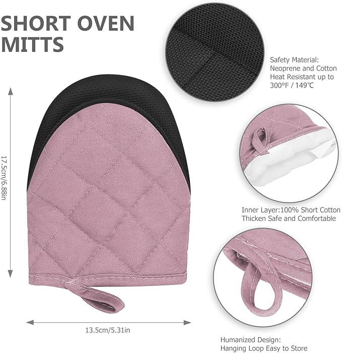 1 Pair Short Oven Mitts - Silicone Kitchen Oven Gloves High Heat Resistant 500℉, Mini Oven Mits with Non-Slip Grip Surfaces and Hanging Loop for BBQ, Baking, Cooking and Grilling (Pink)