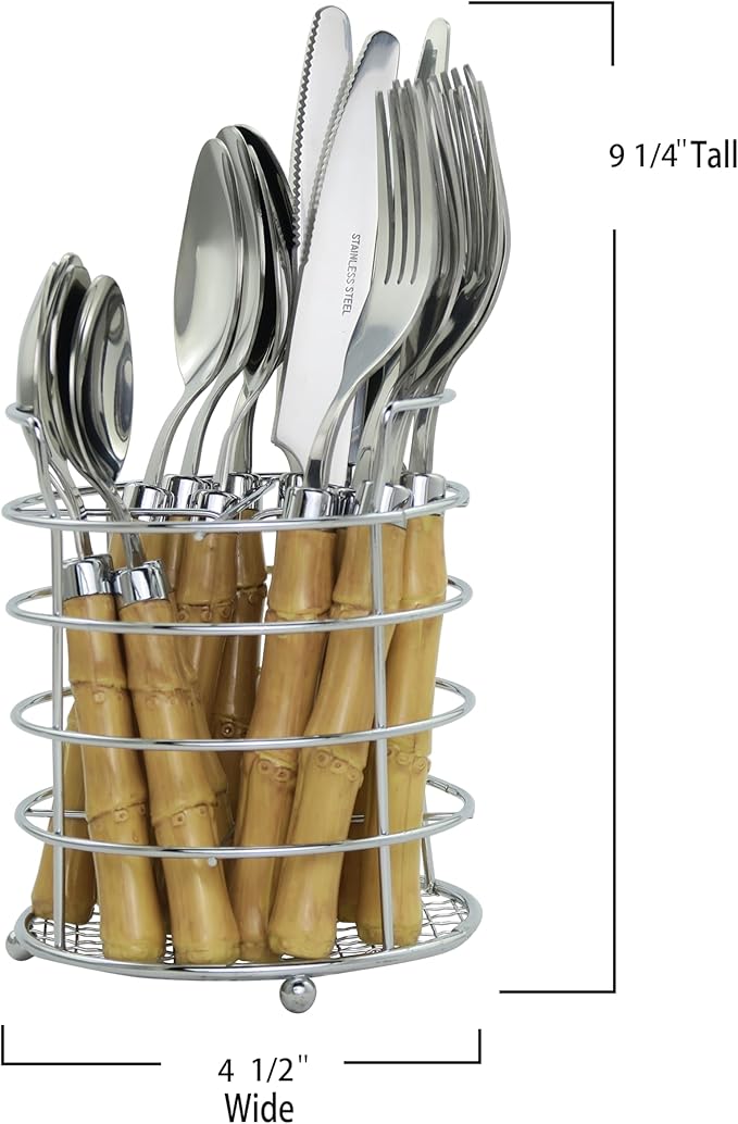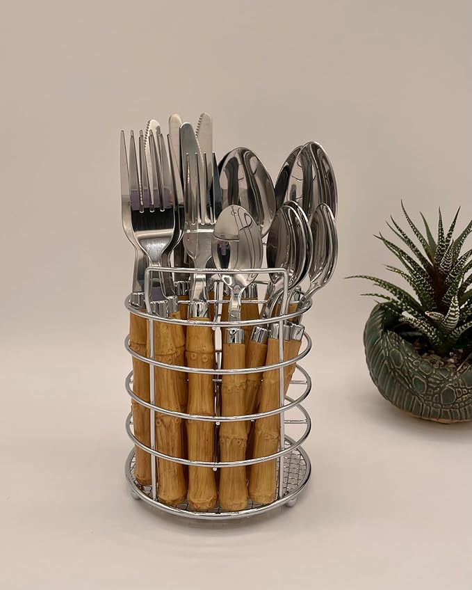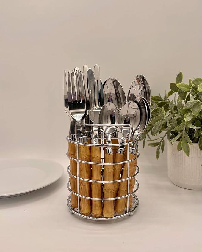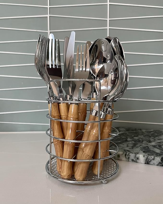 The Original Brink House Beyond Bamboo Stainless Steel Cutlery Set with Naturalistic Bamboo Handles / 16 pieces with Metal Stand, Lifestyle utensils set for home, first apartment, dorm, outdoor events
