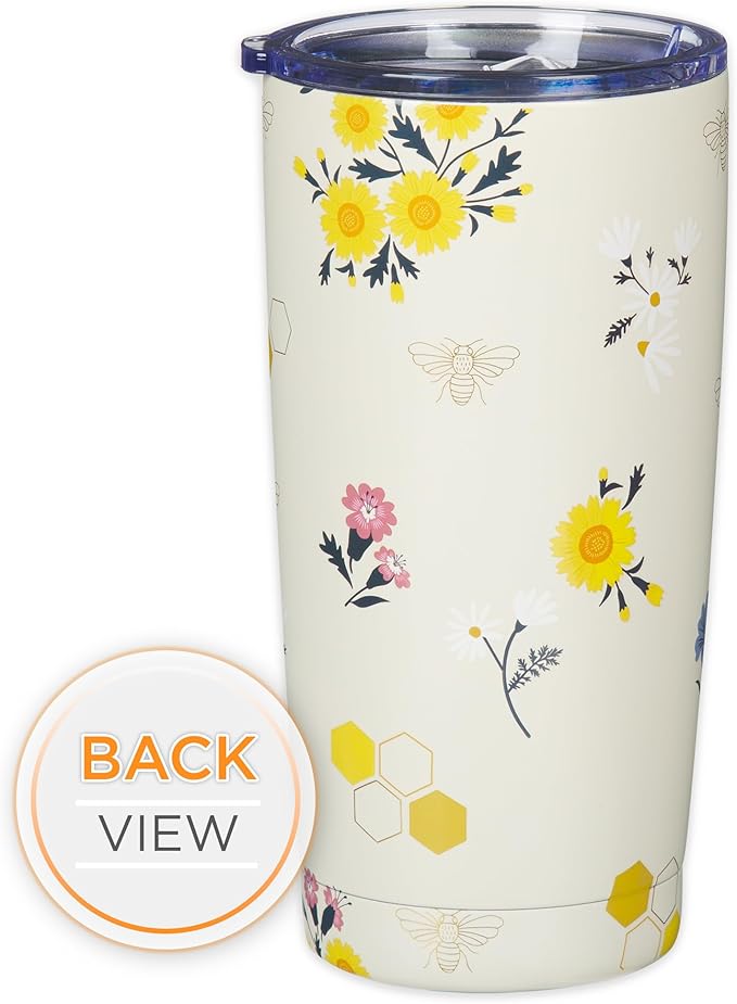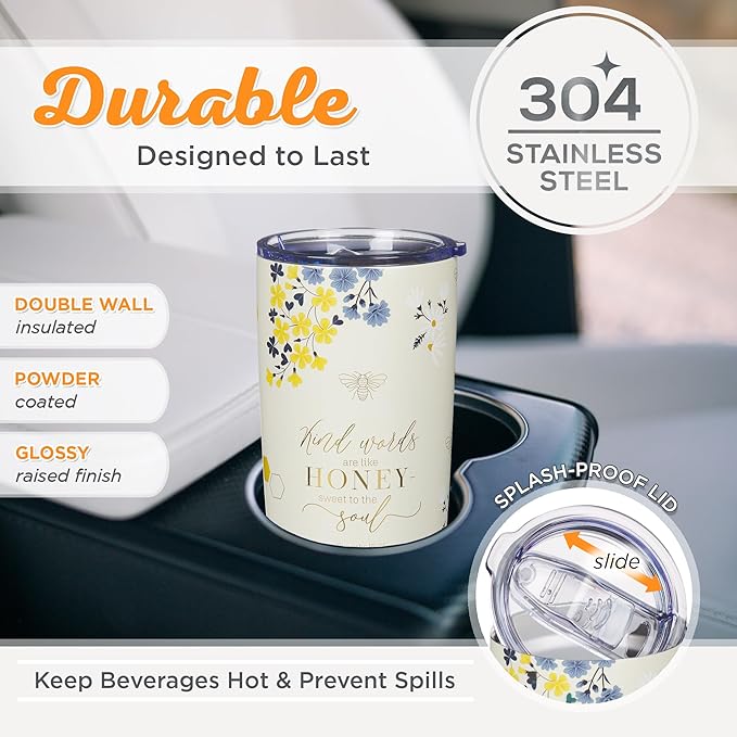 Christian Art Gifts Stainless Steel Scripture Tumbler Travel Mug for Women: Kind Words Bible Verse, Cute Bumble Bee, Double-wall Vacuum Insulated, Lid, Hot/Cold, Creamy White Multicolor Floral, 18oz.