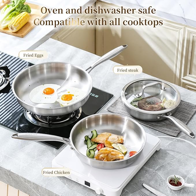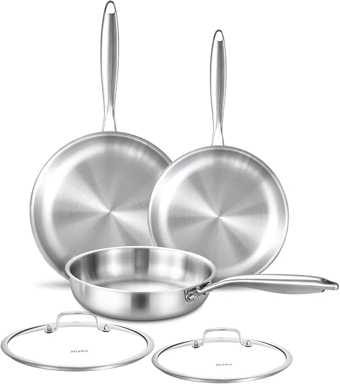 DELARLO Tri-ply Stainless Steel Frying Pan Set with Lid 8" 10" 12" Induction large Skillets Chef's Pan,Pots and Pans Set Kitchen Cookware Set Suitable for All Stove