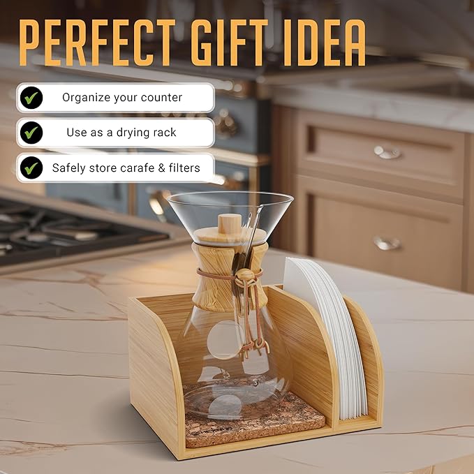HEXNUB – Caddy and Lid for Pour Over Coffee Maker, Bamboo Stand fits Chemex, Bodum, Cosori Coffee Carafes, Heatproof Mat, Filter Holder for Drip Coffee Maker - Cork Mat