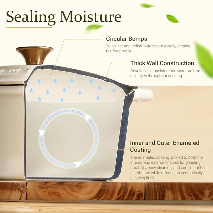 Overmont Enameled Cast Iron Dutch Oven - 5.5QT Pot with Lid Cookbook & Cotton Potholders - Heavy-Duty Cookware for Braising, Stews, Roasting, Bread Baking Cream White