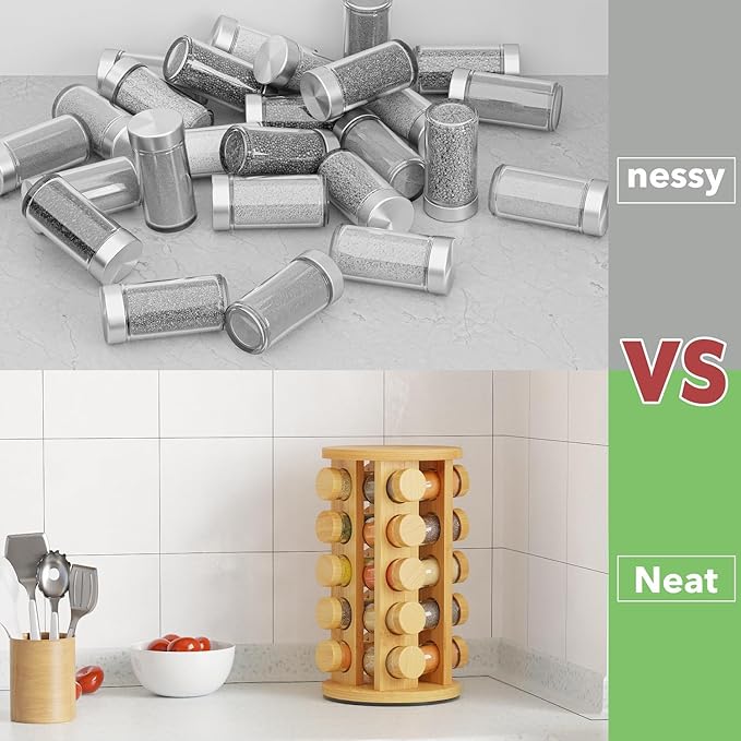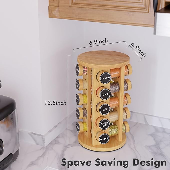 New England Stories Revolving Spice Rack Set with 20 Spice Jars, Kitchen Spice Tower Organizer for Countertop or Cabinet - Carousel Storage Includes 386 Spice Labels (Bamboo)