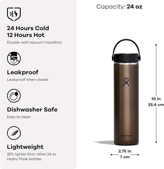 About This Lightweight hydration to keep you going 25 percent lighter than other Hydro Flask 24 oz Wide Mouth bottles... Read more