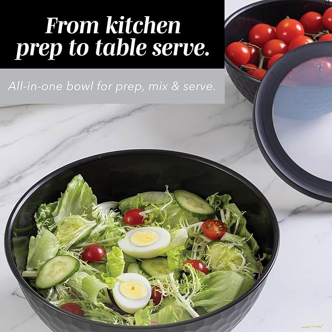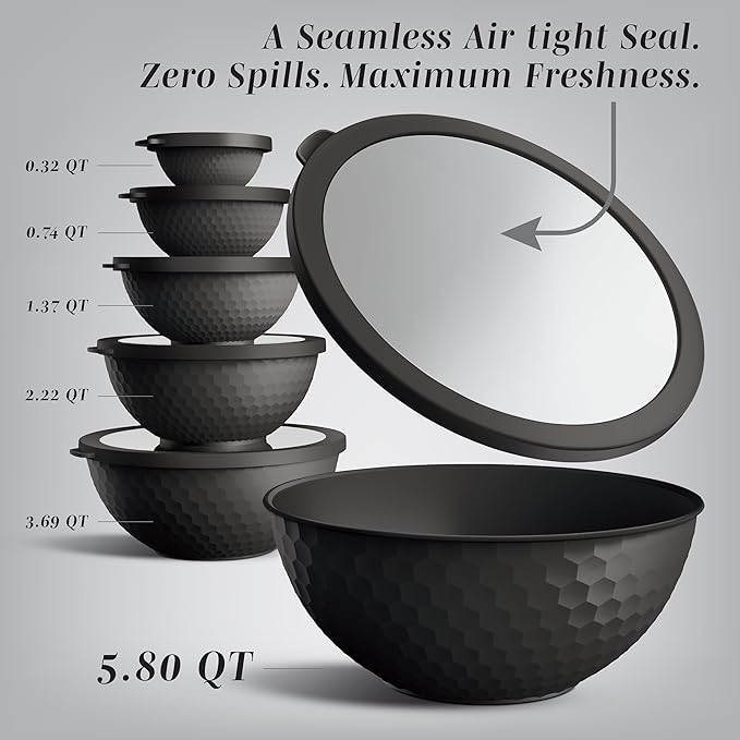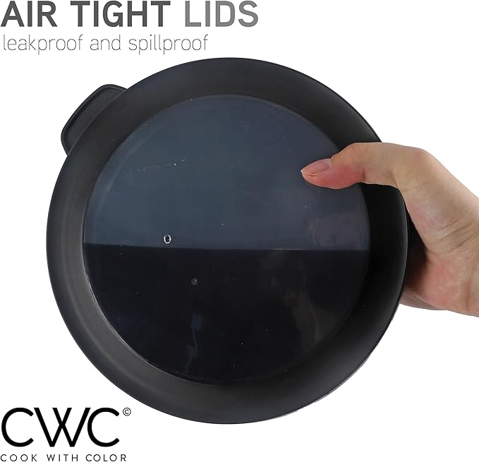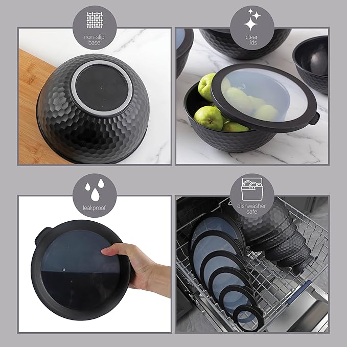 COOK WITH COLOR Mixing Bowls with Lids - 12 Piece Plastic Nesting Bowls Set includes 6 Prep Bowls and 6 Lids, Non Slip Bottom and Embossed Design - Microwave Safe (Black)