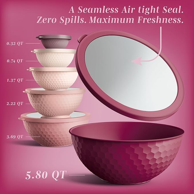 COOK WITH COLOR Mixing Bowls with Lids - 12 Piece Plastic Nesting Bowls Set includes 6 Prep Bowls and 6 Lids, Non Slip Bottom and Embossed Design - Microwave Safe (Rose)