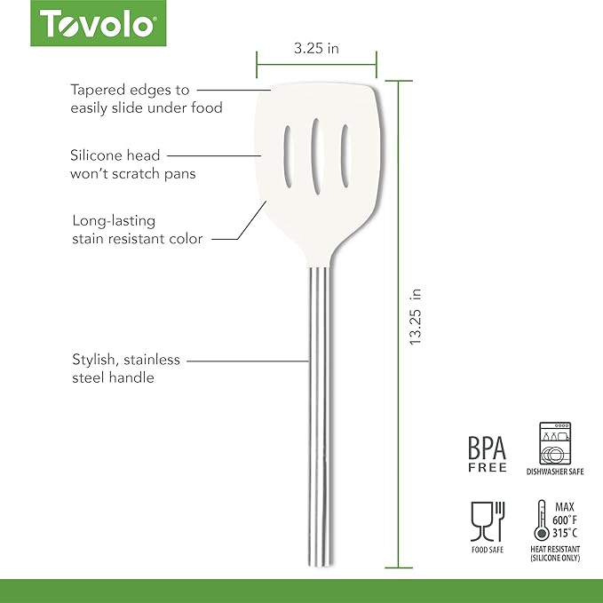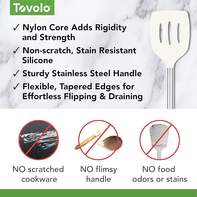 Tovolo Silicone Slotted Turner With Stainless Steel Handle, Pancake Spatula, Scratch-Resistant Kitchen Utensil for Nonstick Cookware & Cast Iron Skillets, White, 1 Count
