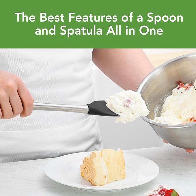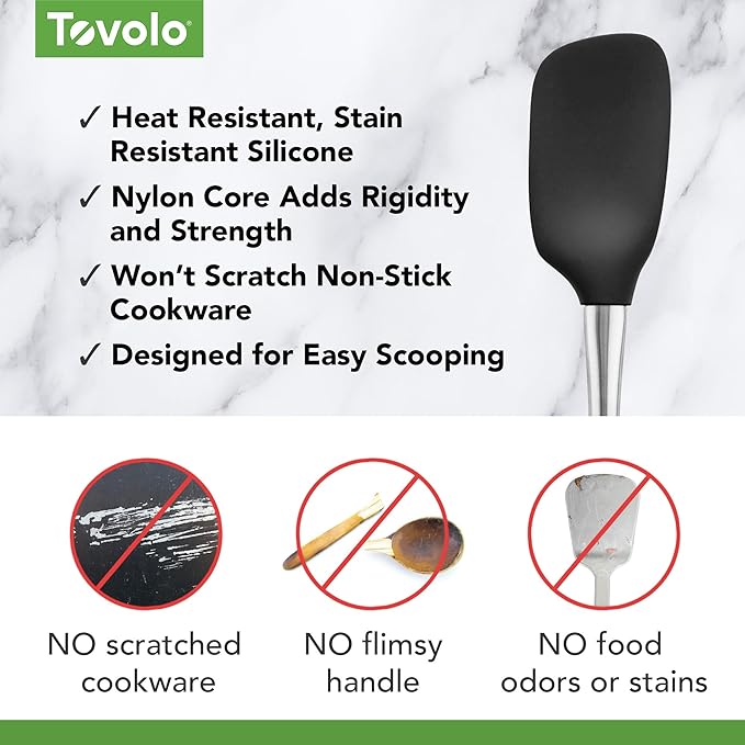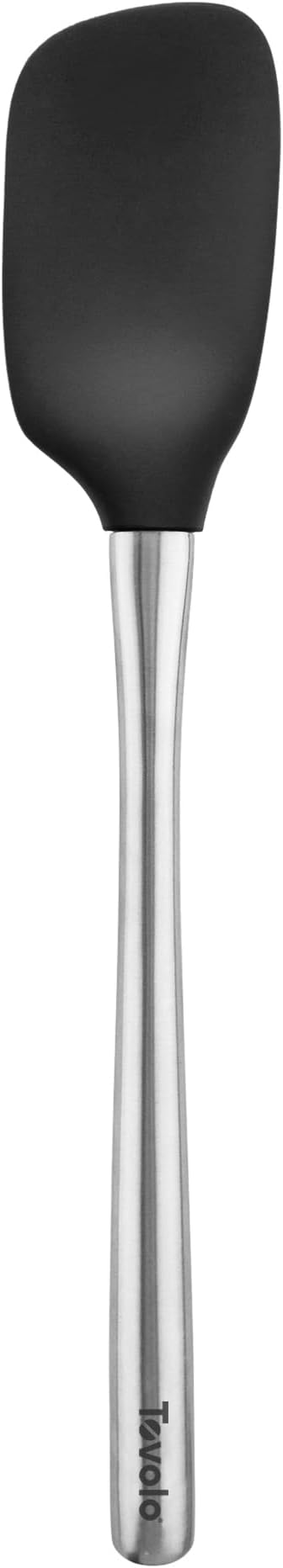 Tovolo Spoon Spatula Spoonula with Stainless Steel Handle Ergonomic Grip Black, Silicone Scoopula Kitchen Utensil Non Scratch Easy Clean Dishwasher Safe Heat Resistant Flex Core Scoop Spatula