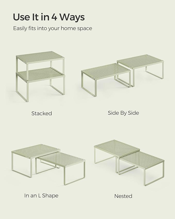 SONGMICS Spice Racks, Set of 4 Metal Cabinet Shelf Organizers, Countertop Organizers, Shelf Risers, Stackable, Expandable, Sage Green UKCS006C01