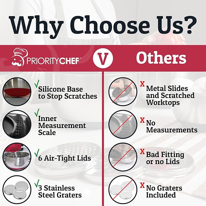 Priority Chef Stainless Steel Mixing Bowls with Lids Set, 3 Grater Attachments, Airtight Lids, Non-Slip Silicone Base Mixing Bowl Set, Large Prep Metal Mixing Bowls for Kitchen, Red