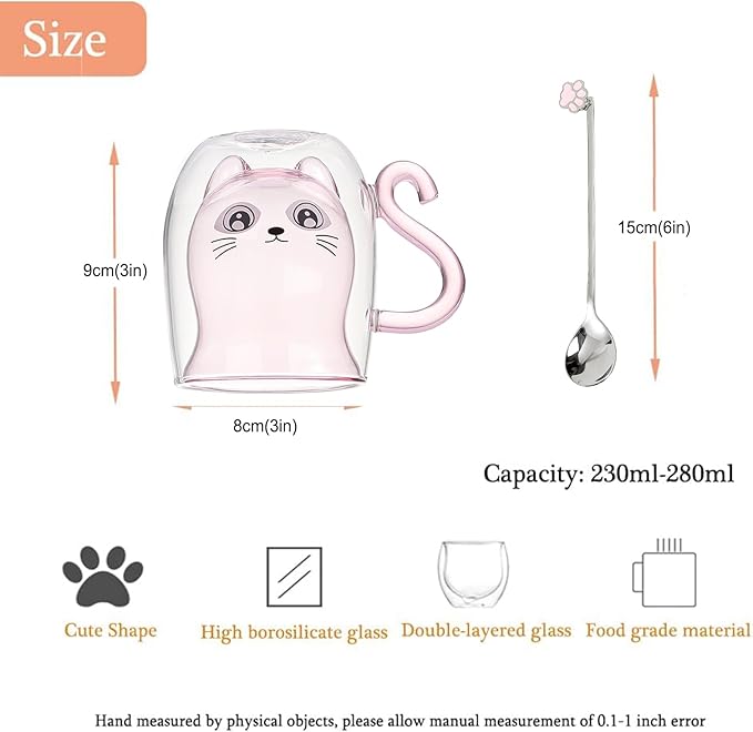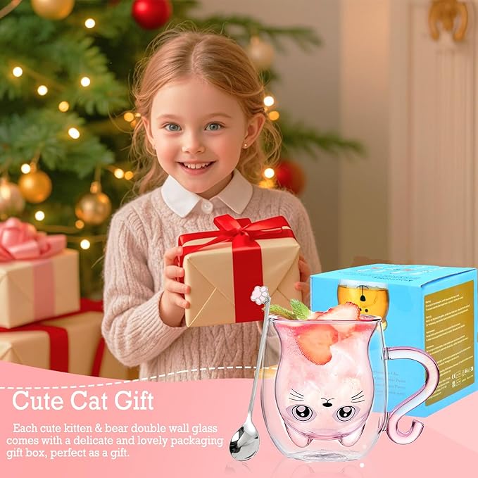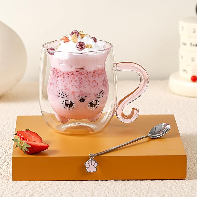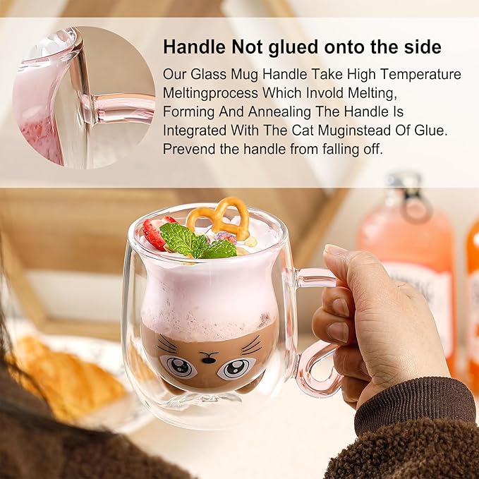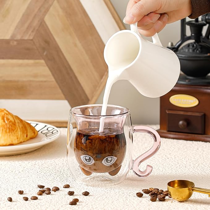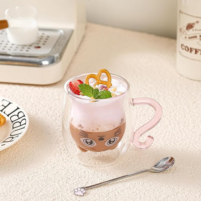 Cute Mugs Glasses Double Wall Insulated Glasses Espresso Cup, Coffee Cup, Tea Cup, Milk Cup, Best Gift for Office and Personal Birthday, Pink Cat