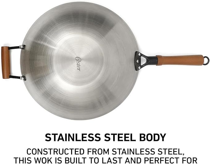 Oster Sangerfield 14-Inch Stainless Steel Wok With Wood Handles, Durable Non-Stick Stir Fry Pan for Gas and Electric Stovetops
