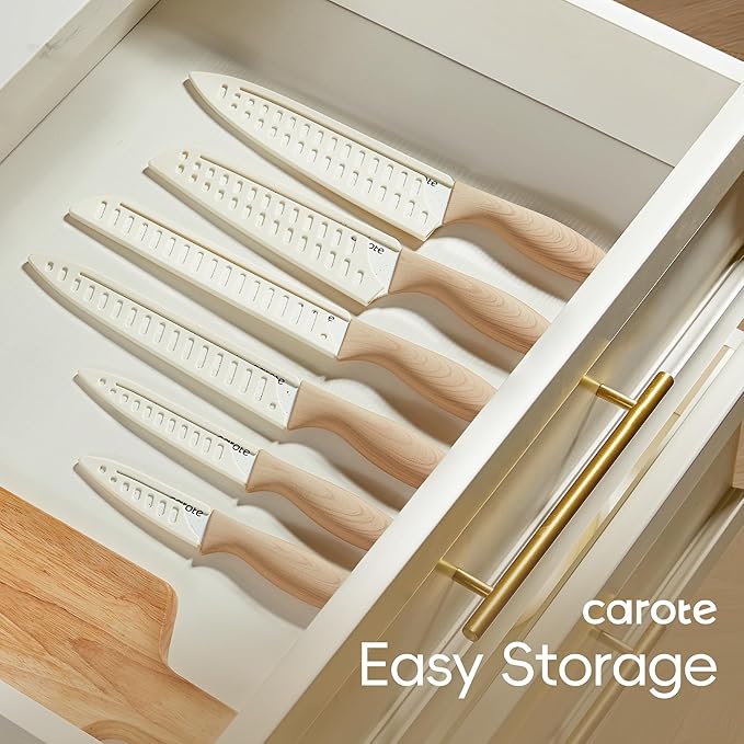 CAROTE 12PCS Knife set with Blade Guards,Granite Nonstick Ceramic Coating,Stainless Steel blade, Wood Grain Handle, Essential knife set,White