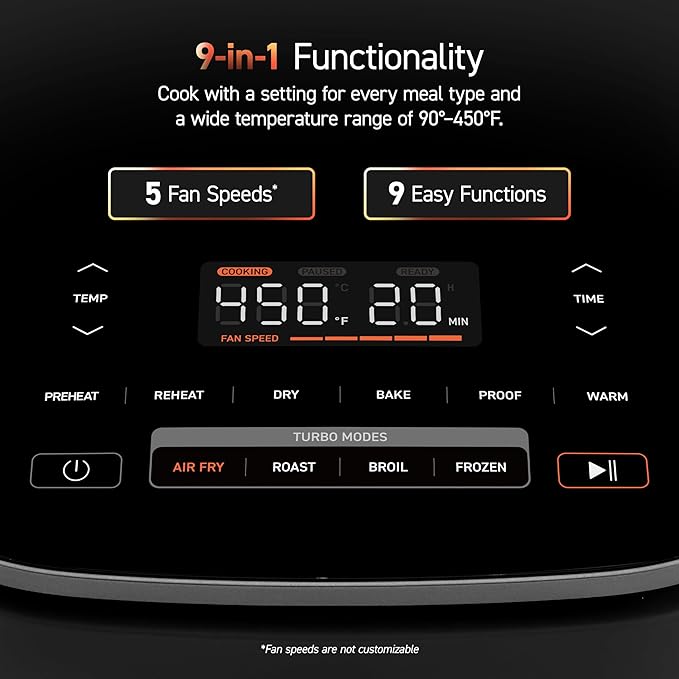 About This Product 1: 9-in-1 Versatility: With a 9-in-1 functionality, it includes Air Fry, Roast, Bake, Broil, Dehydrate, Frozen, Proof,... Read more