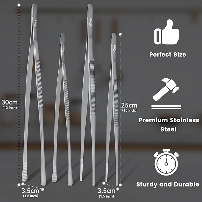 HOTEC Kitchen Tweezers Tongs Stainless Steel, Set of 4-10" and 12inch Extra-Long Food Tweezers Fine Kitchen Tongs for Cooking,Grill and Baking