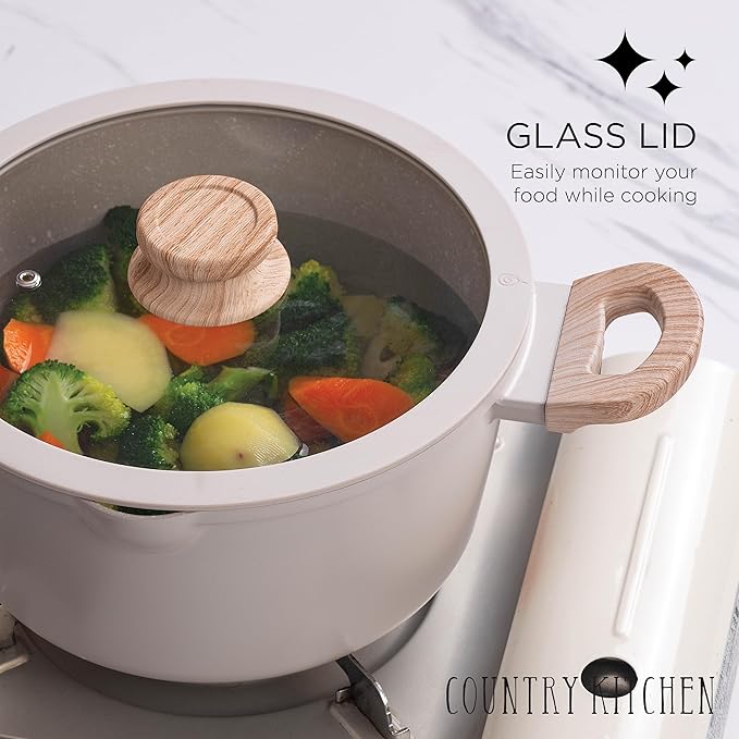 Country Kitchen Non-Stick Cast Aluminum Cookware Set - Durable Kitchen Cookware for Everyday Cooking, Cream Round Handle, 11 Pc.