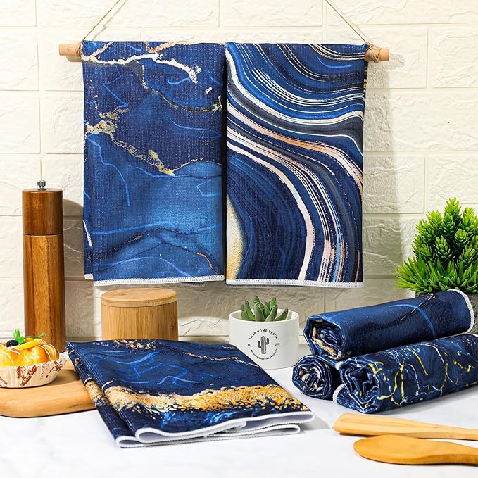 Boyiee Set of 6 Marble Kitchen Towels Blue Gold Hand Modern Absorbent Soft Decorative Dish Tea Towels 24 x 16 Inches Kitchen Gifts for Farmhouse Bathroom Decorations