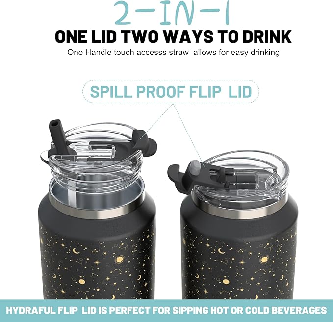 • Innovative 2-in-1 Lid Structure: Experience the best of both worlds with our lid that seamlessly integrates a sipping spout and a flip-top. Adapt to your beverage of choice – sip leisurely or flip open for a satisfying gulp. Versatility meets practicality. 100% leak proof and spill -resistant.