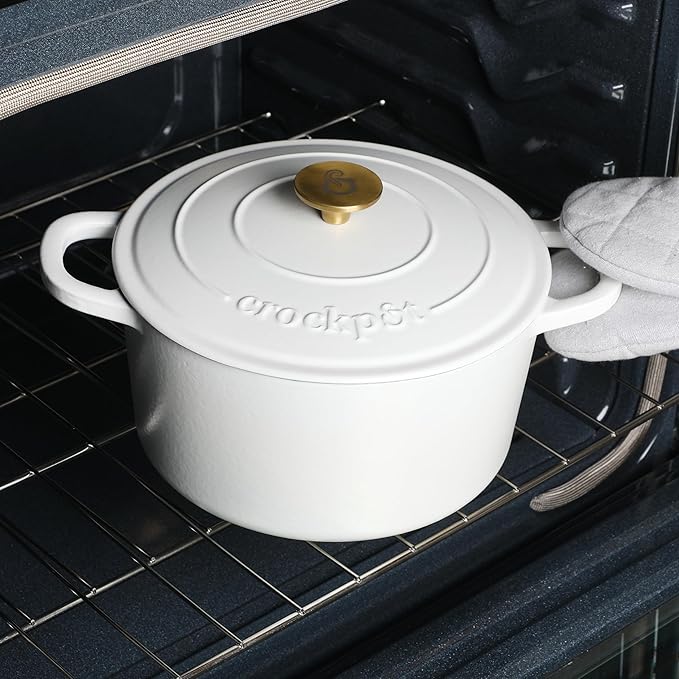 Crock-Pot Artisan 7-Quart Round Dutch Oven – Matte Linen White with Gold Knob, Enameled Cast Iron Cookware