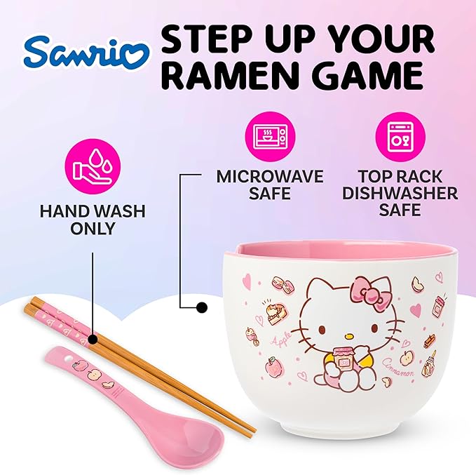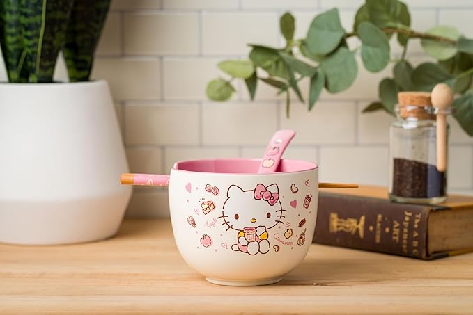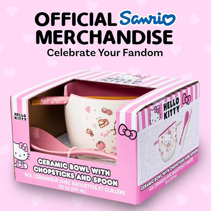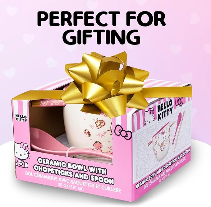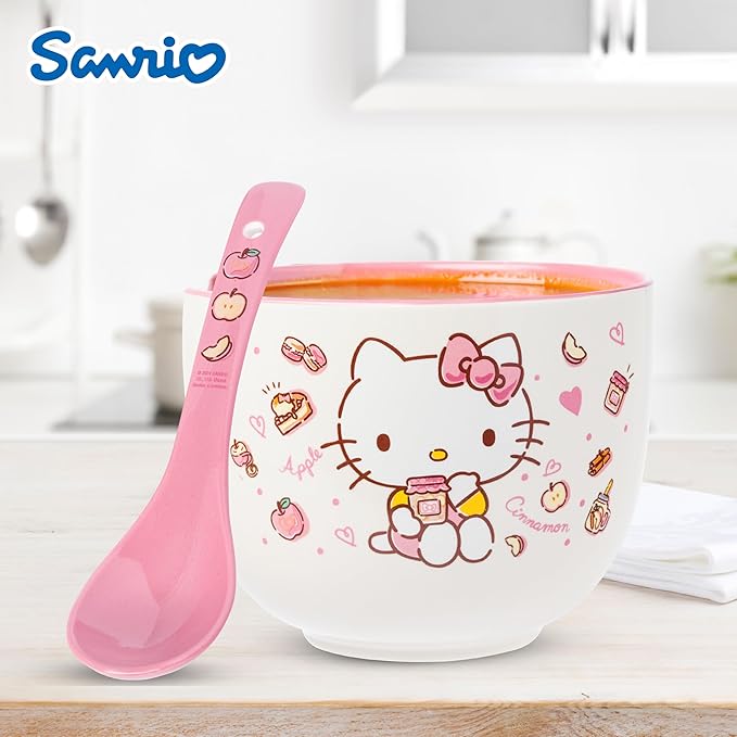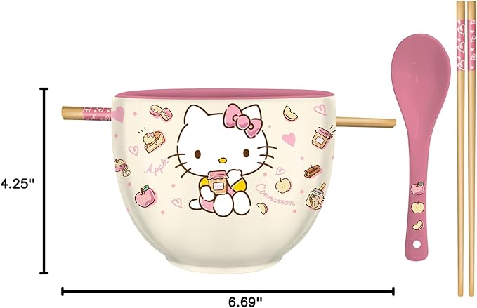 Silver Buffalo Sanrio Hello Kitty Apples and Cinnamon Ceramic Ramen Noodle Rice Bowl with Chopsticks and Spoon, Microwave Safe, 20 Ounces