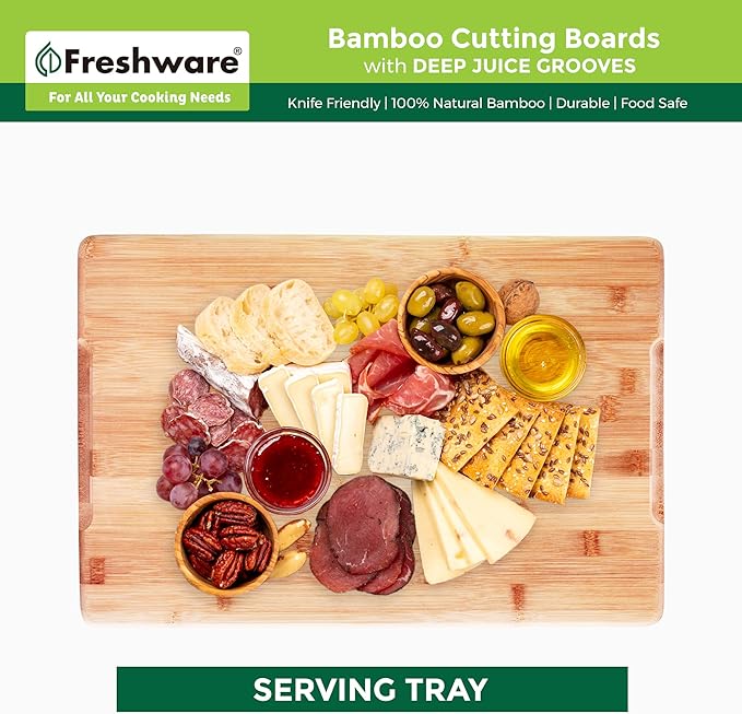 Freshware Wood Cutting Boards for Kitchen - Bamboo Cutting Board Set of 3, Cutting Boards with Juice Grooves, Serving Board Set, Chopping Board for Meat, Veggie, Easy Grip Handle (9x6", 12x8", 15x10")