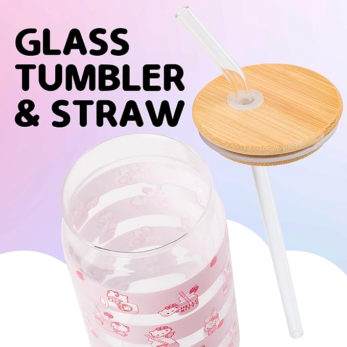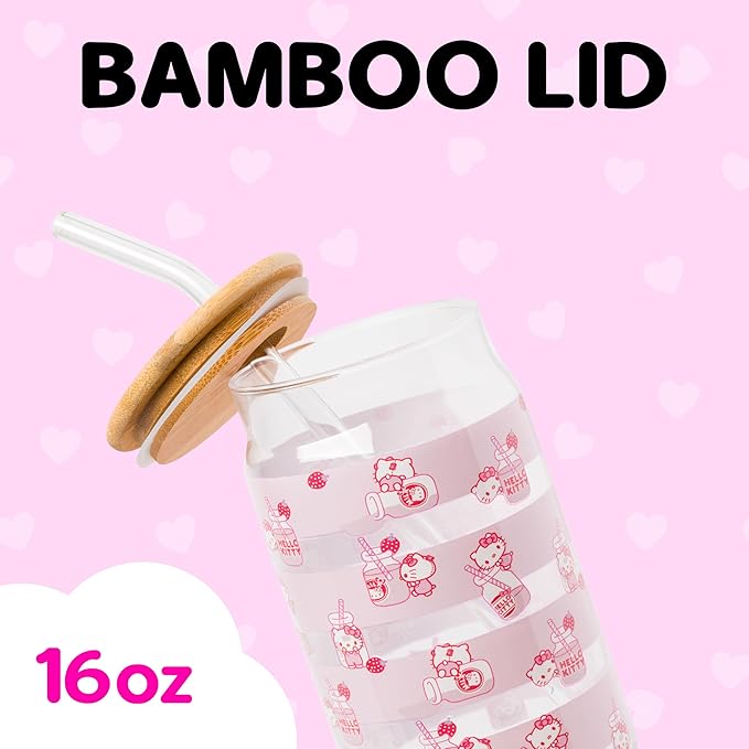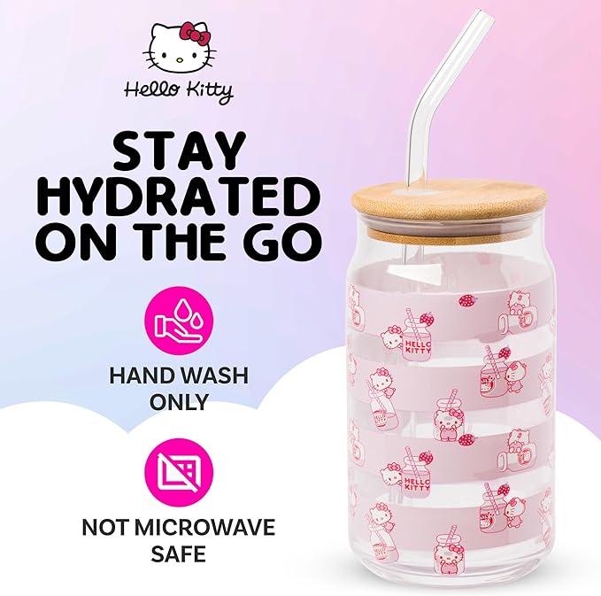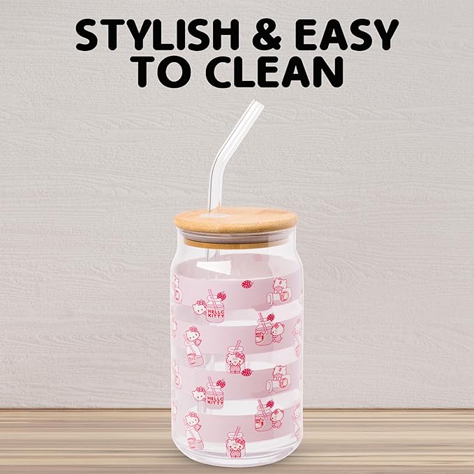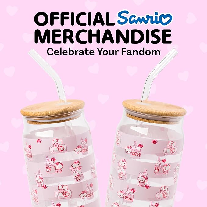 Silver Buffalo Sanrio Hello Kitty Strawberry Milk Pink Glass Jar Tumbler with Bamboo Lid and Glass Straw, 16 Ounces
