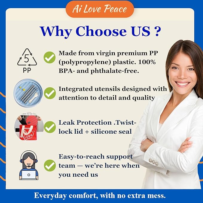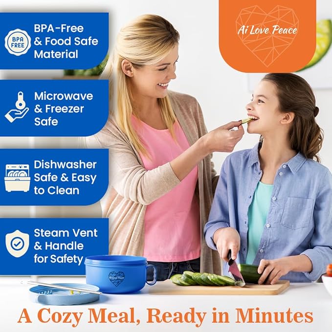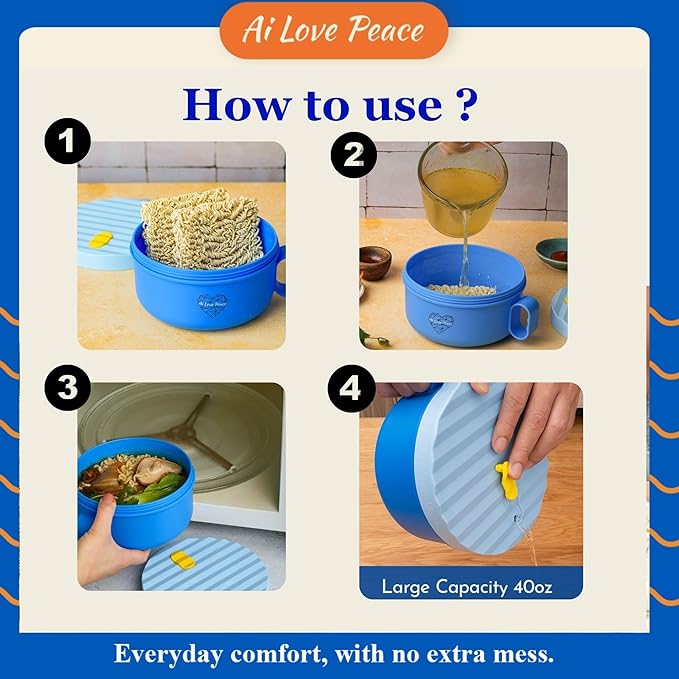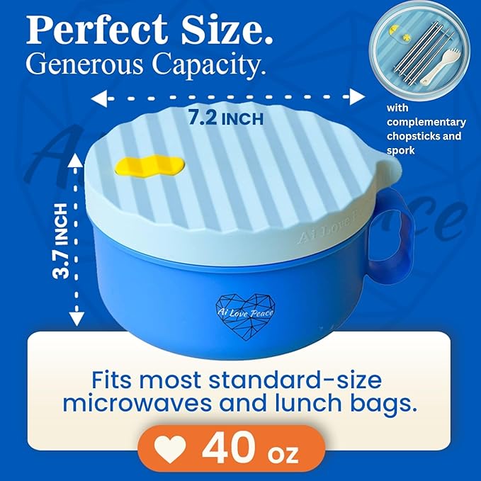 AI LOVE PEACE Ramen Bowl, 40 oz Microwaveable Noodle Cooker for Ramen, Pho, Soup, and Pasta, Dishwasher Safe and Portable, Ideal for Home, Office, Dorm, or Gift (Blue)