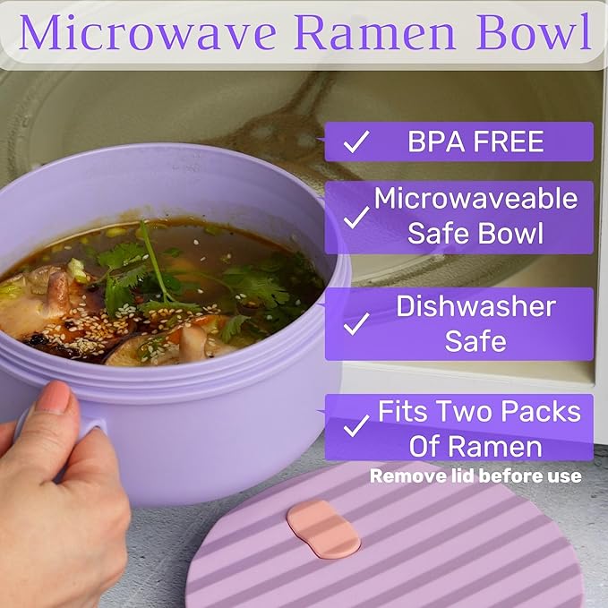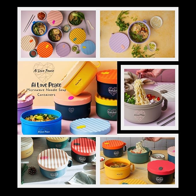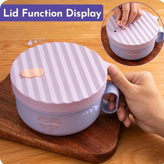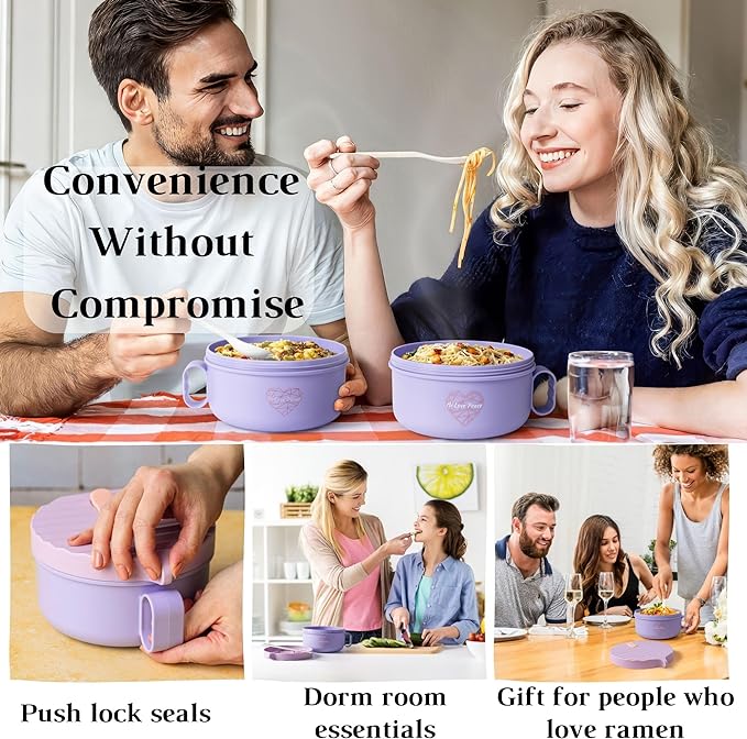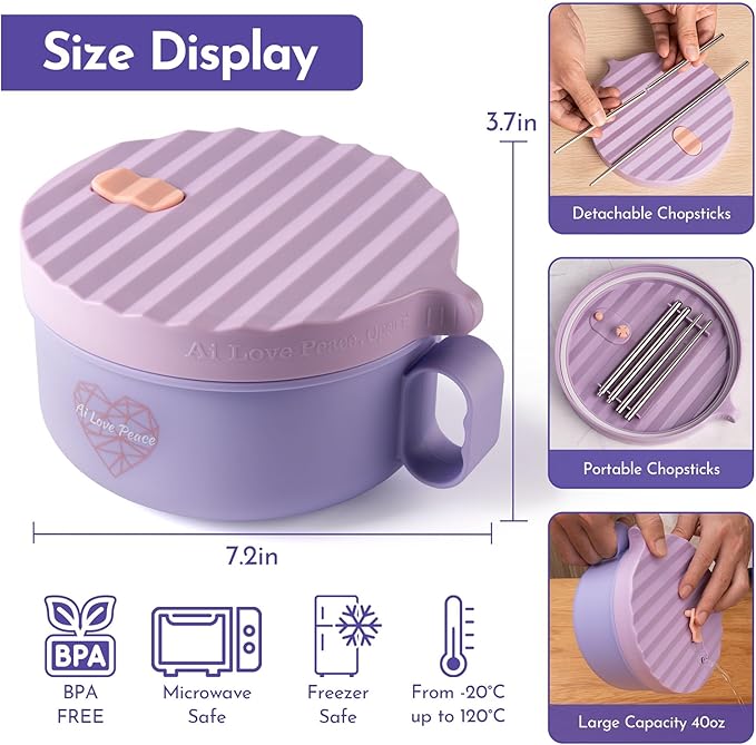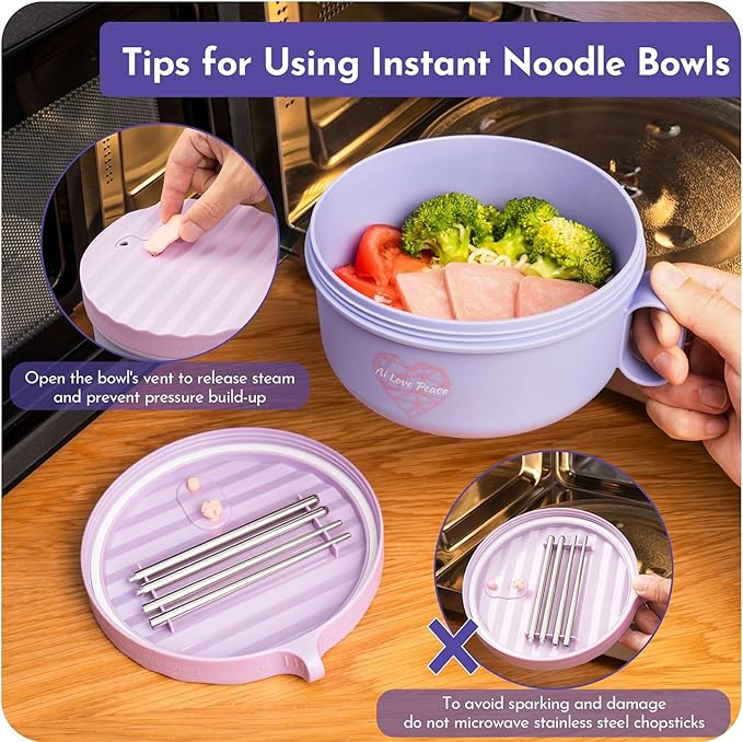 AI LOVE PEACE Ramen Bowls, 40 oz Large Microwavable Noodle Bowls (2 Purple) with Chopsticks, Sporks, and Utensil Bag, Portable Microwave Bowl for Home, Office, Dorm, or College Gift.