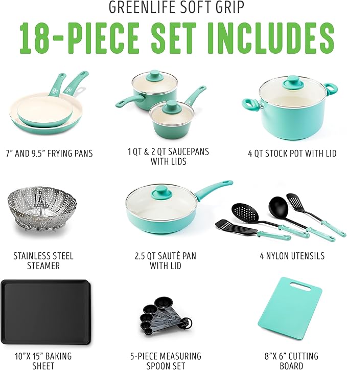 GreenLife Soft Grip Healthy Ceramic Nonstick 18 Piece Kitchen Cookware Pots and Frying Sauce Saute Pans Set, PFAS-Free with Kitchen Utensils and Lid, Dishwasher Safe, Turquoise