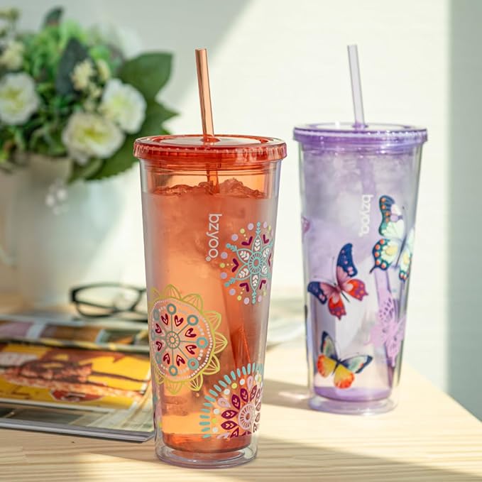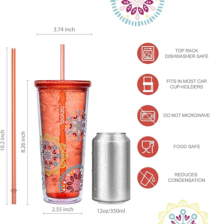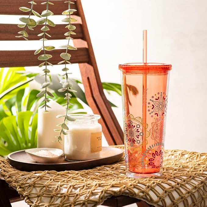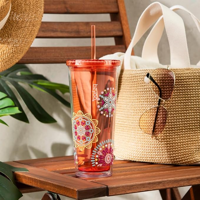 bzyoo SIP 24oz (710ml) Double Wall Plastic Tumbler with Lid and Straw Cold Drink Travel Mug Reusable Party Cup Perfect for Ice Coffee, Tea Office Poolside Parties Gifts Color: Medallion Orange