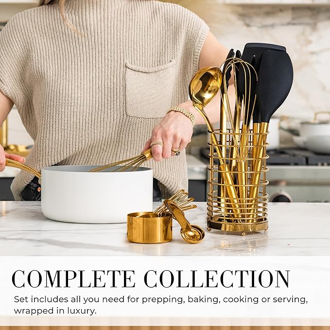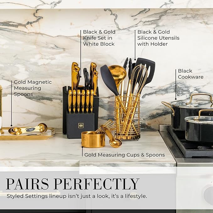 Styled Settings Black and Gold Kitchen Utensils Set - 15-Piece Nonstick BPA-Free Silicone Cooking Tools with Measuring Cups and Spoons - Luxury Kitchen Accessories for Stylish Cooking and Baking