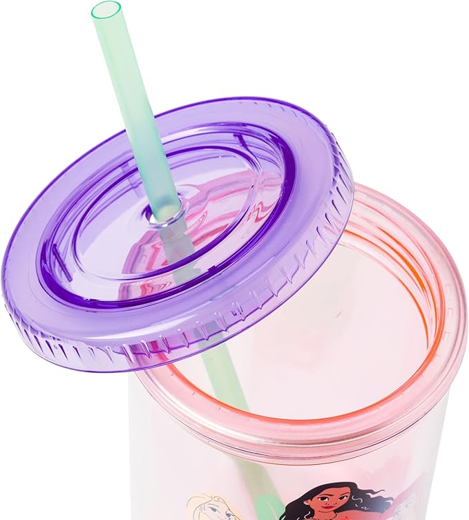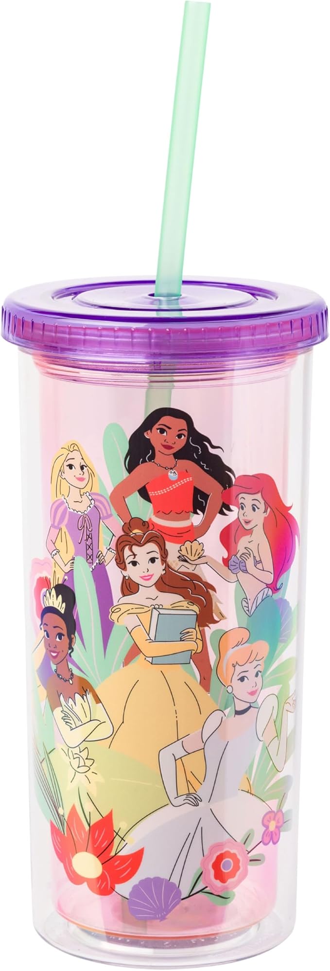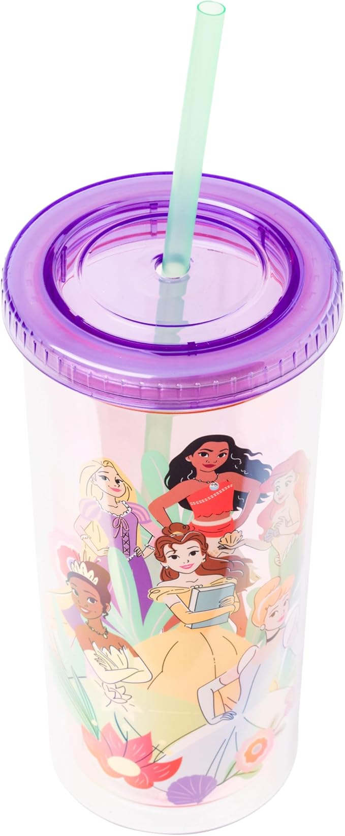 Silver Buffalo Disney Princess Featuring Moana, Rapunzel, Ariel, Tiana, Belle, and Cinderella Plastic Tall Cold Cup with Lid and Straw, 20 Ounces