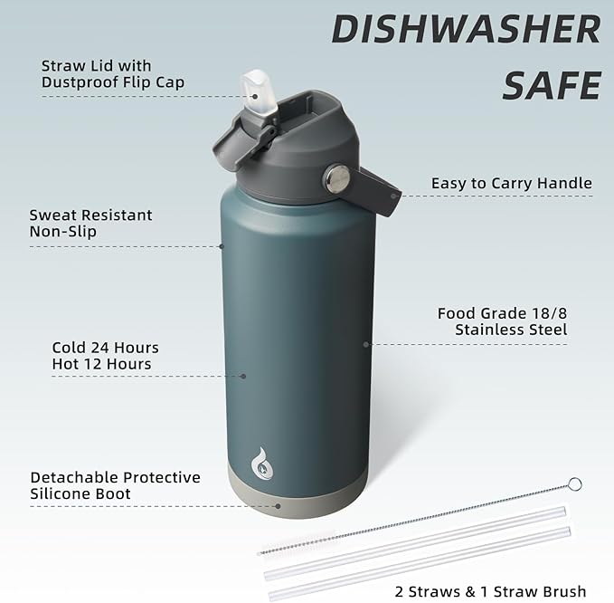 BJPKPK Water Bottle with Straw Lid, 32oz Vacuum Insulated Water Bottles, Metal Stainless Steel Thermo for Sports, Travel, BPA Free Leak Proof Thermo, Cups, Flasks, Tumblers, Grey