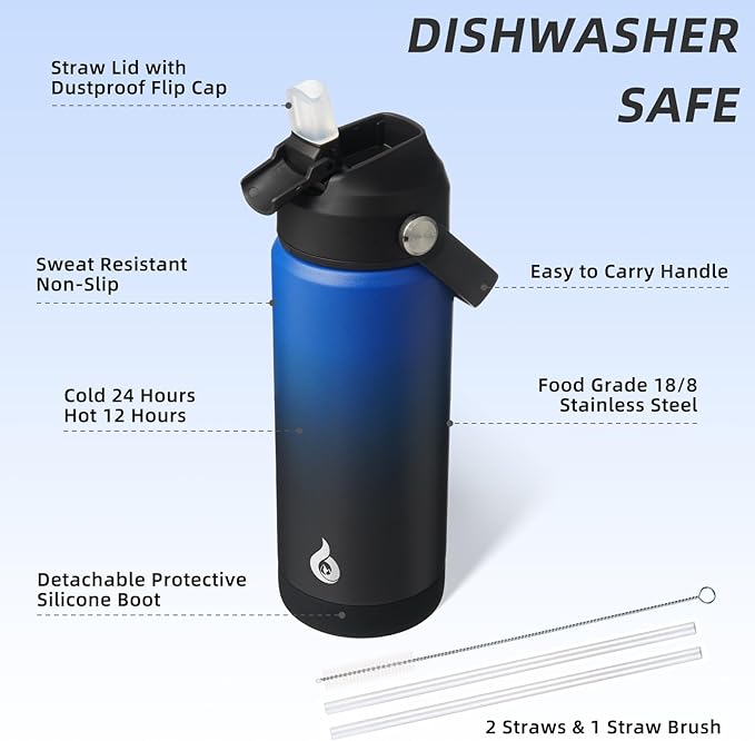 BJPKPK Insulated Water Bottle with Straw Lid, 18oz Thermo Water Bottles, Flex Handle & Non-slip Boot, BPA Free Leak Proof Stainless Steel Metal Thermo, Tumblers, Cups,Black Blue
