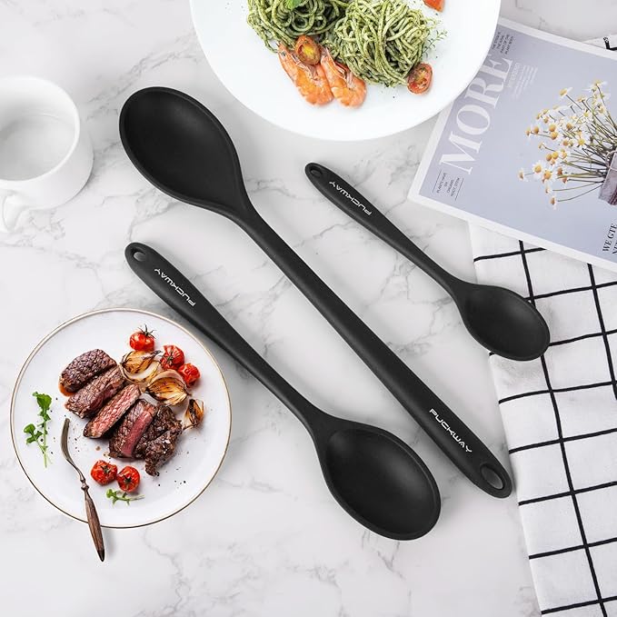 3 Pcs Silicone Spoons Set of 7.9 10.6 14.2 inch for Cooking, Heat Resistant Kitchen Spoons for Mixing, Stirring, and Serving, Small to Large Non Stick (Black)