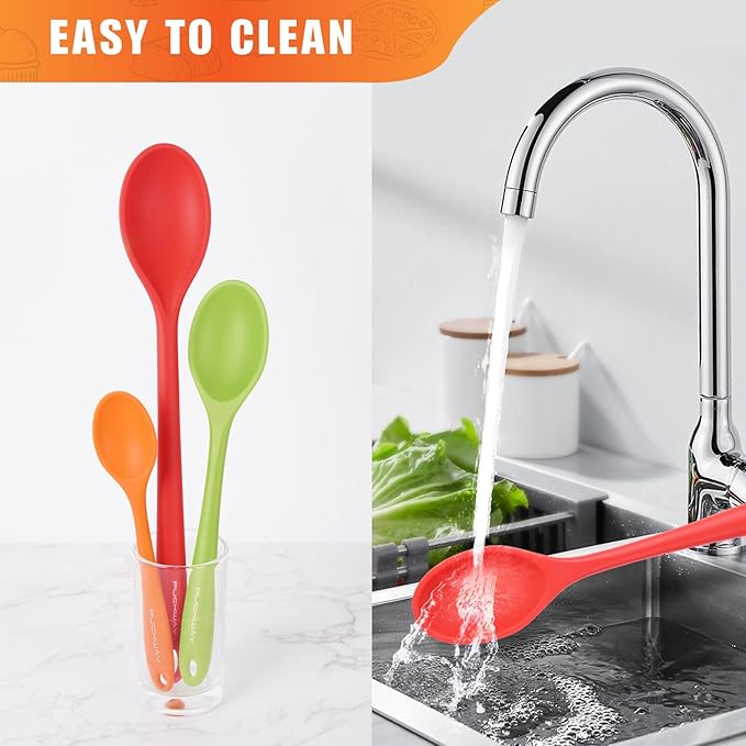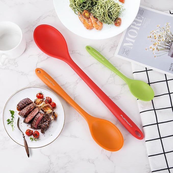 3 Pcs Silicone Spoons Set of 7.9 10.6 14.2 inch for Cooking, Heat Resistant Kitchen Spoons for Mixing, Stirring, and Serving, Small to Large Non Stick (Red & Orange & Green)