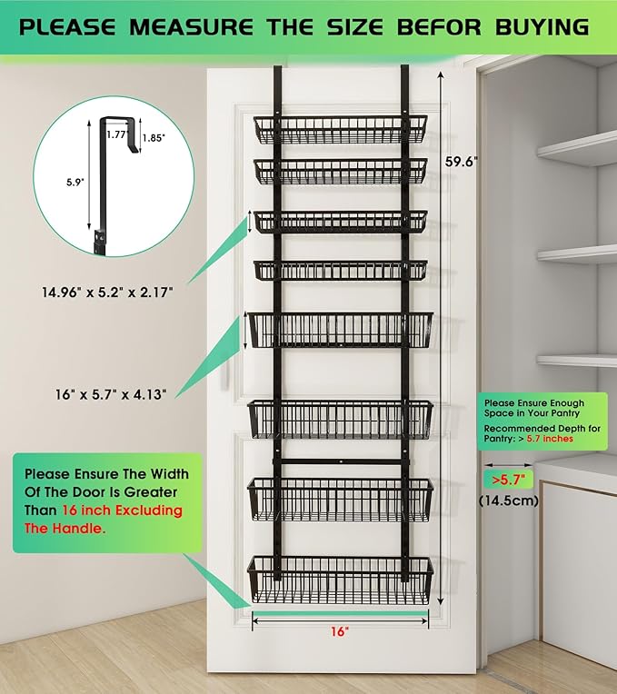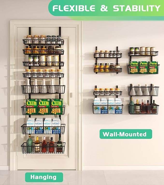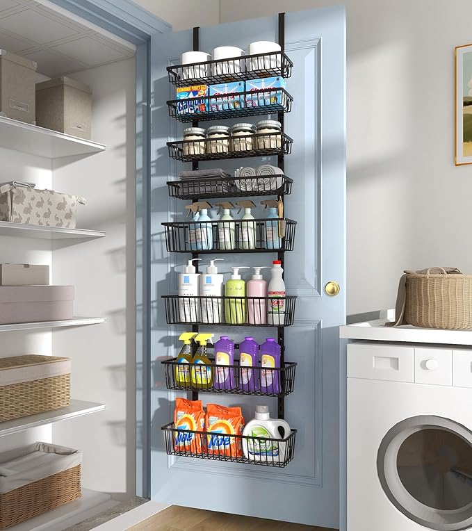 Over The Door Pantry Organizer, Pantry Organization and Storage, 8-Tier Deep Baskets Hanging Heavy-Duty Metal, Wall Spice Rack Seasoning Shelves for Home & Kitchen, Laundry Room Bathroom, Black
