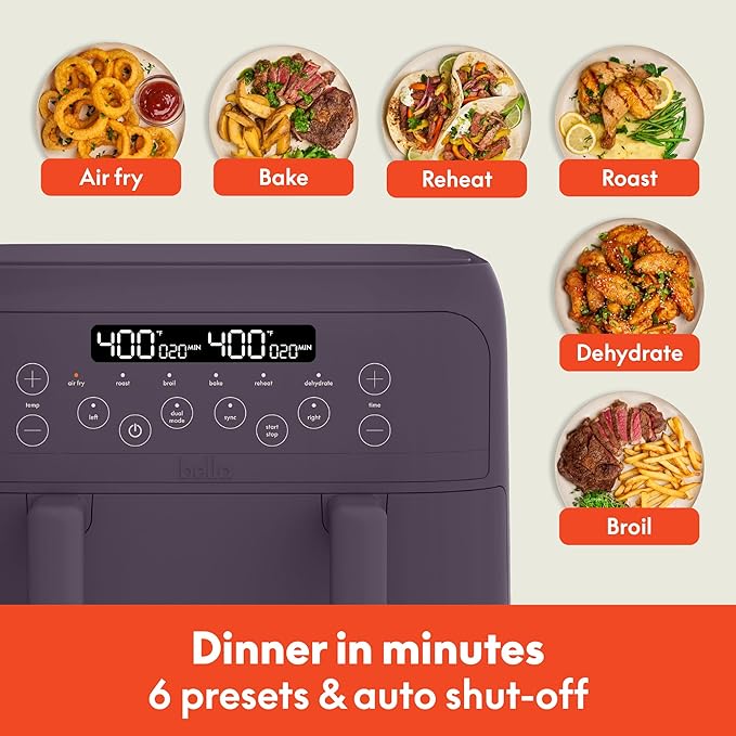 bella 4 Qt TriZone Air Fryer, EverGood™ Ceramic Nonstick Coating, Dual Basket Design w Removable Divider, Digital Touchscreen Control w 6 Preset Cooking Options, 1200 Watt, 3lb Capacity, Plum