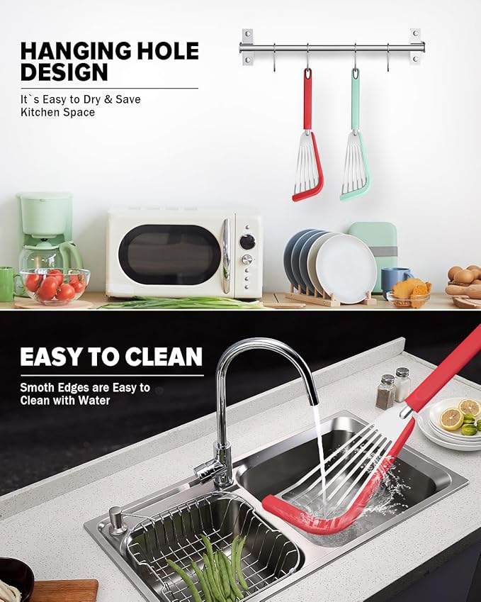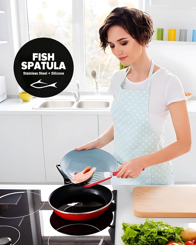 Silicone Fish Spatula Turner Set of 2, Thin Slotted Spatulas Turner for Nonstick Cookware,Heat Resistant Flexible Stainless Steel Kitchen Cooking Spatula Flipper for Fish, Egg, Pancake (RGN)