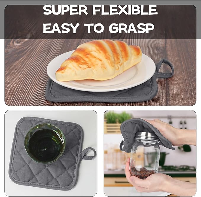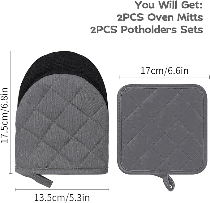 • 4 PIECE GREAT VALUE HOUSEHOLD ESSENTIALS PACK: Super value for 4pcs short oven mitts and pot holders, including 2 oven mitts(6.8 x 5.3in) and 2 pot holders (6.6 x 6.6in), perfect for daily use and coordinate well with your house and kitchen.