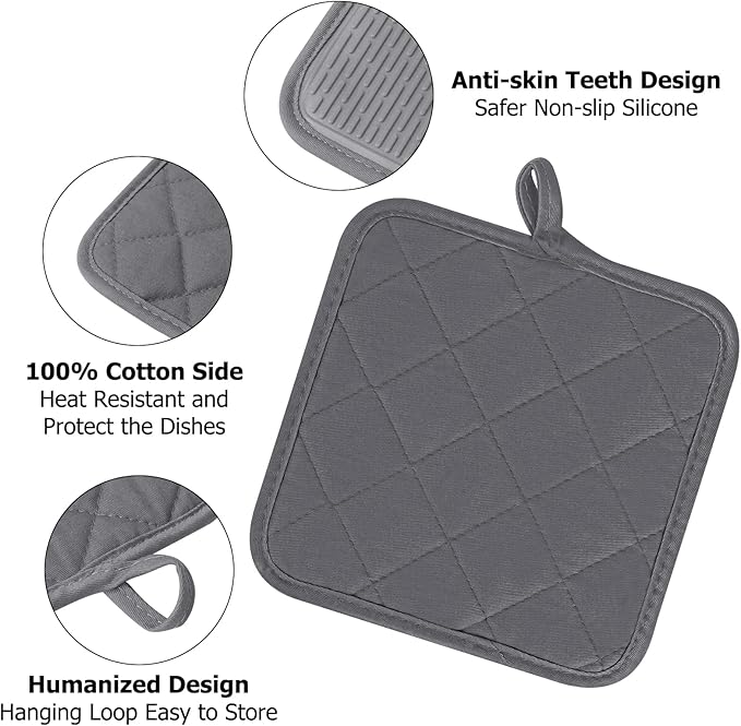 • COMFORT & SOFT COTTON FABRIC: Both oven mitts and potholders are made of durable neoprene and cotton, has 2-layer, with soft inner. Comfortable to touch, protect your hands from heat, steam and grease. Using in kitchen, stains are inevitable, but you can hand wash them with warm water and soap. Also they are machine washable.
