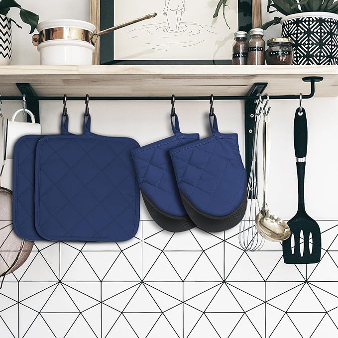 • 4 PIECE GREAT VALUE HOUSEHOLD ESSENTIALS PACK: Super value for 4pcs short oven mitts and pot holders, including 2 oven mitts(6.8 x 5.3in) and 2 pot holders (6.6 x 6.6in), perfect for daily use and coordinate well with your house and kitchen.