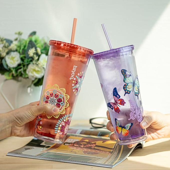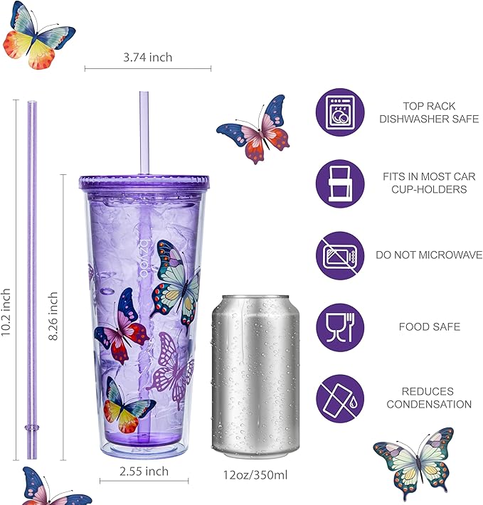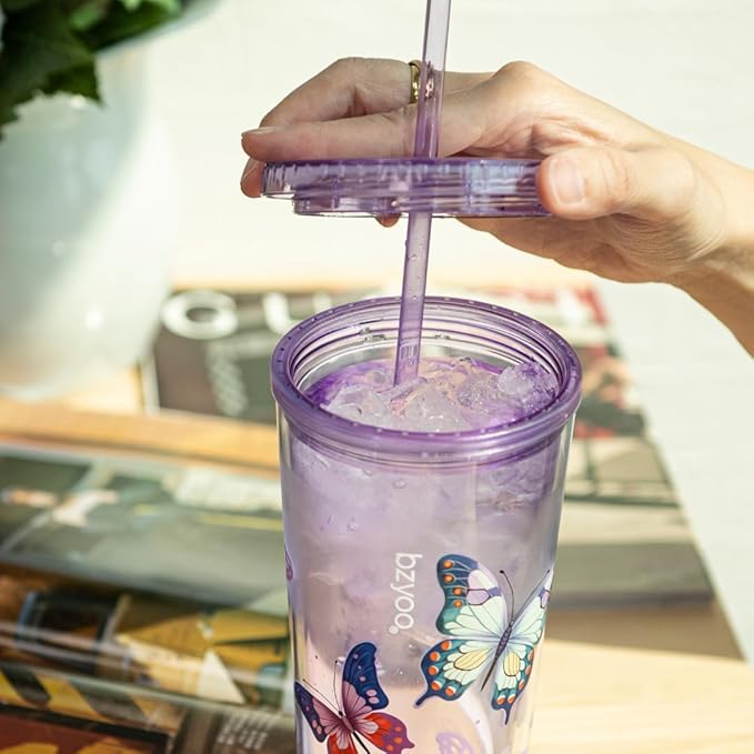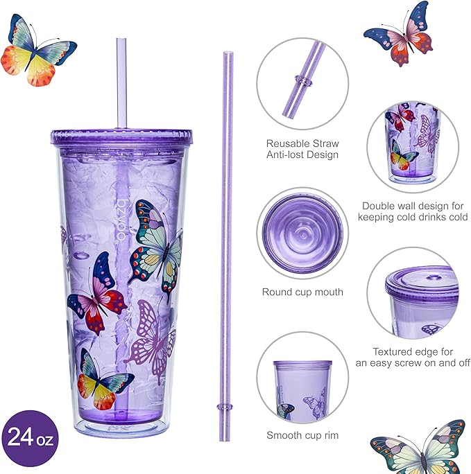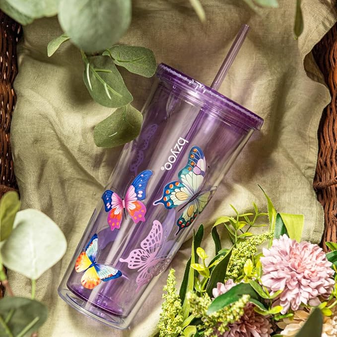bzyoo SIP 24oz (710ml) Double Wall Plastic Tumbler with Lid and Straw Cold Drink Travel Mug Reusable Party Cup Perfect for Ice Coffee, Tea Office Poolside Parties Gifts Color: Butterfly Purple