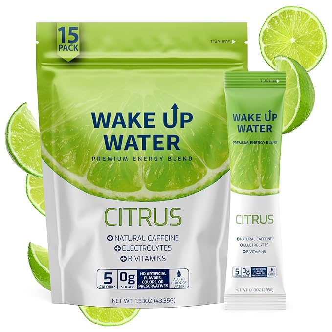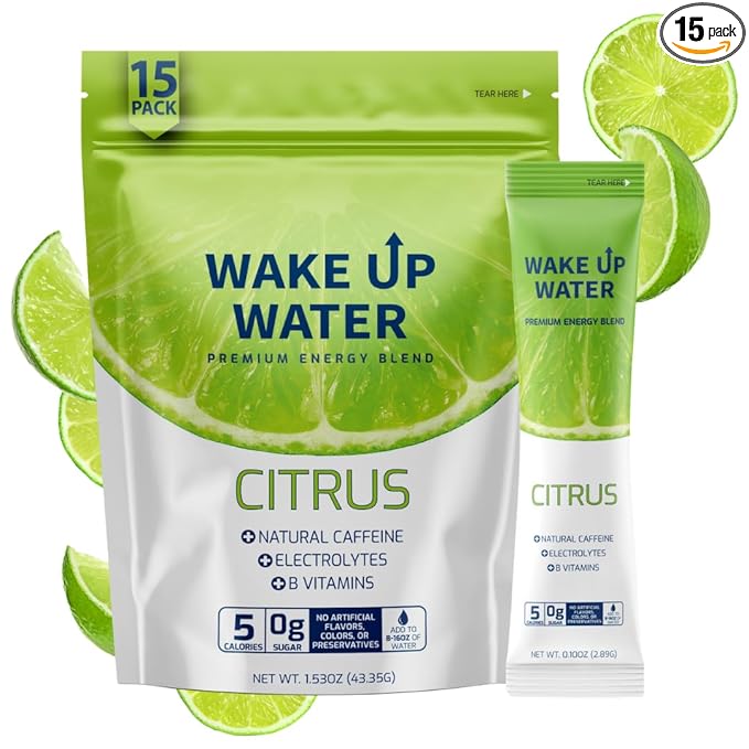 Wake Up Water Energy Drink Mix, Sugar Free Clean Energy Powder with Electrolytes & B Vitamins, Natural Caffeine for Focus & Hydration (15 Pack) - Citrus